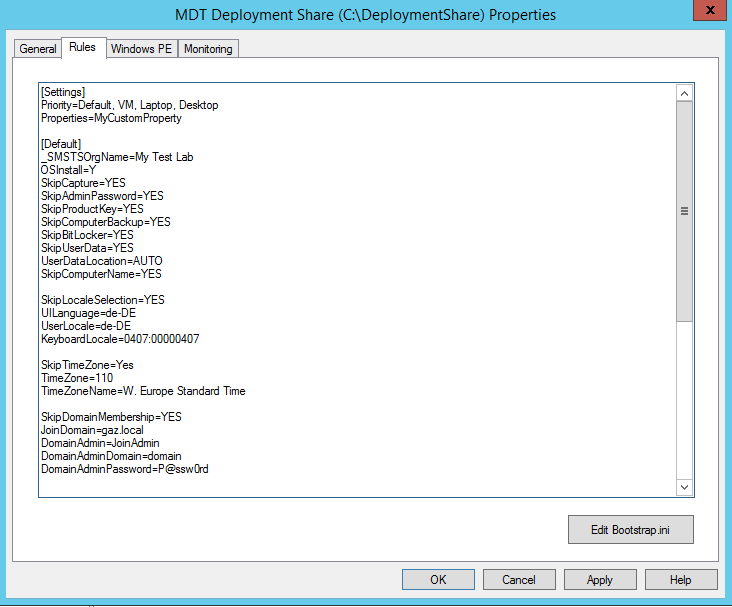 Die Einstellungen der Bootstrap.ini lassen sich unter den Eigenschaften des Deployment Shares aufrufen: