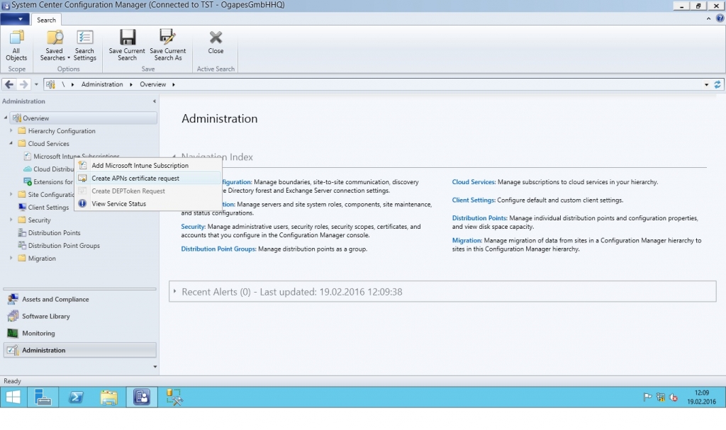 Im Fall das der SCCM verwendet wird, muss keine PKI speziell für Intune vorhanden sein. Einzig damit Intune mit Apple Geräten kommunizieren kann, muss im SCCM eine Zertifikatsignieranforderung erstellt werden. Mit dieser Zertifikatsignieranforderung können Sie bei der Zertifizierungsstelle von Apple ein Apple Push Notification Service-Zertifikat (APNs) beantragen; siehe auch Abbildung 2 weiter unten. Erst wenn dieses Zertifikat vorhanden ist, kann Intune über SCCM mit Apple Geräten kommunizieren. Die Gültigkeit dieses Zertifikates beträgt 12 Monate. Alle weiteren Zertifikate werden direkt von Microsoft Intune an die entsprechenden Geräte verteilt.