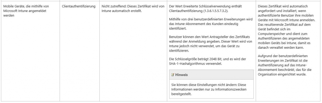 Die folgenden beiden Abbildungen zeigen, dass man sowohl für die Server als auch für die Clients keine speziellen Zertifikate in Verbindung mit SCCM und Intune extra anzufordern muss, da diese automatisch von Intune angefordert und in der SCCM Datenbank bzw. im Computerspeicher des Gerätes installiert werden, wenn man Microsoft Intune abonniert bzw. wenn authentifizierte Benutzer ihre mobilen Geräte mit Intune anmelden.